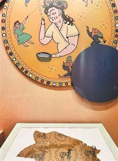 “丝绸的故事——古今中外再想象”展览中展出的唐代黄地联珠团窠鹿纹锦残片和艺术家作品。